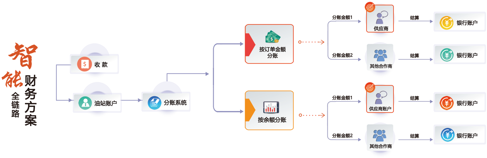 根据油站的不同需求设置分账比例,系统自动向不同账户进行实时分发降低财务运营成本,提升资金运营效率。